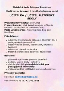 Mateřská škola Bělá pod Bezdězem hledá novou posilu na pozici učitelka MŠ na plný úvazek do přátelského kolektivu.